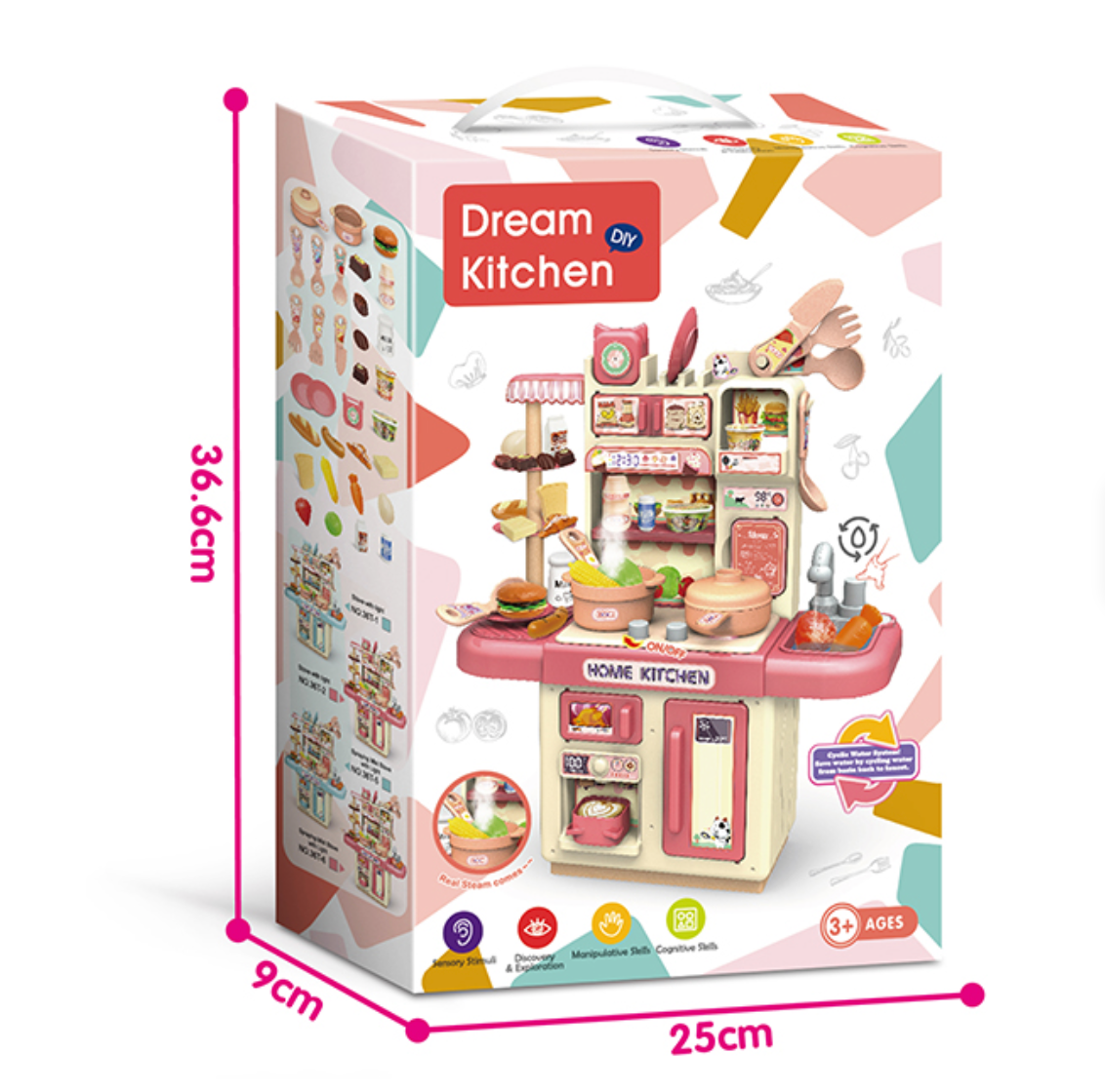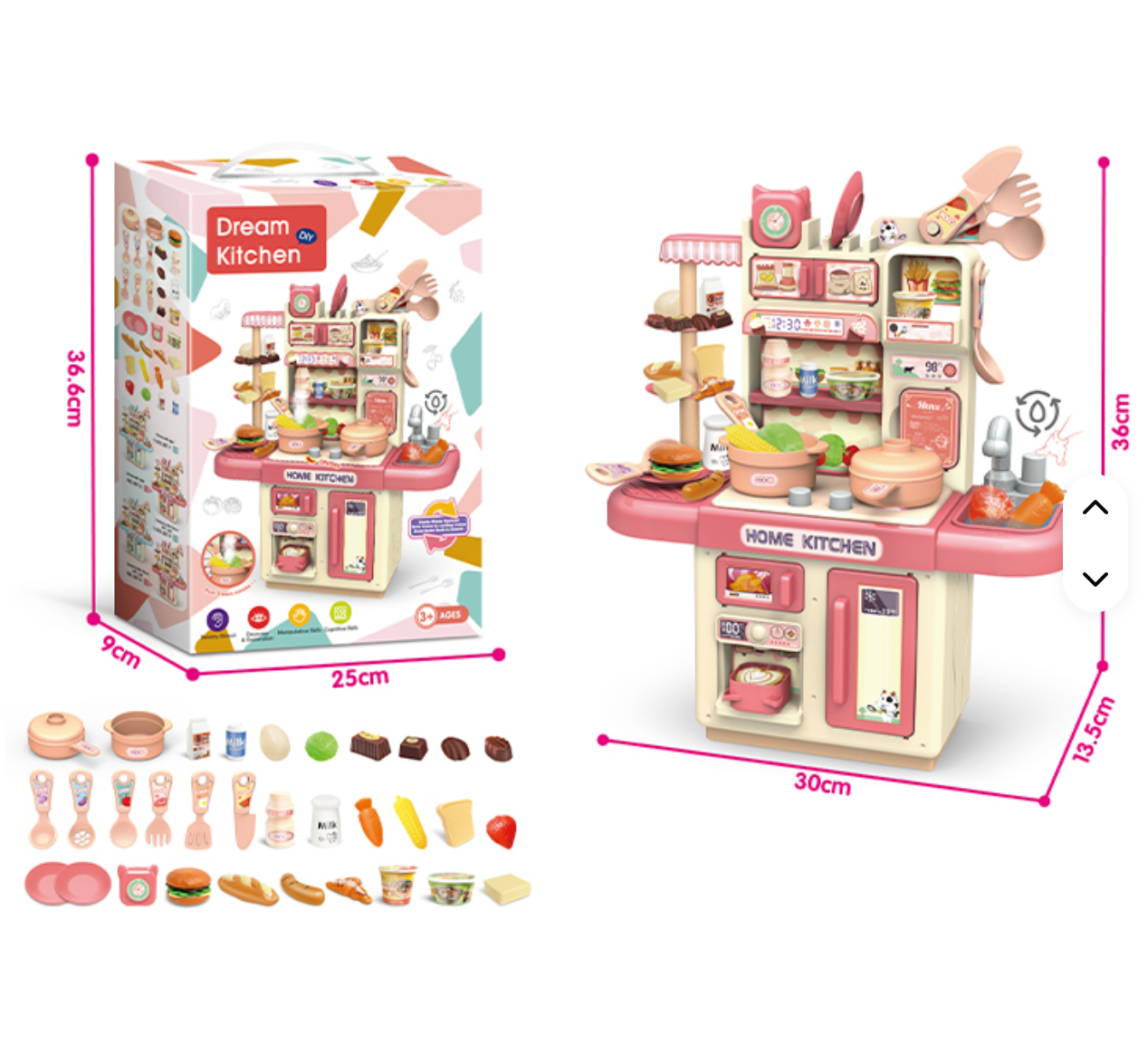 Contenido del Paquete: 1 Estuche/Maleta Transformable que se convierte en cocina de altura media, 1 Grifo/Llave, 1 Fregadero/Lavaplatos, 1 Estufa/Hornilla, y varios Utensilios y Alimentos de Juguete(olla, sartén, cuchara, cuchillo, vegetales de fantasía).
