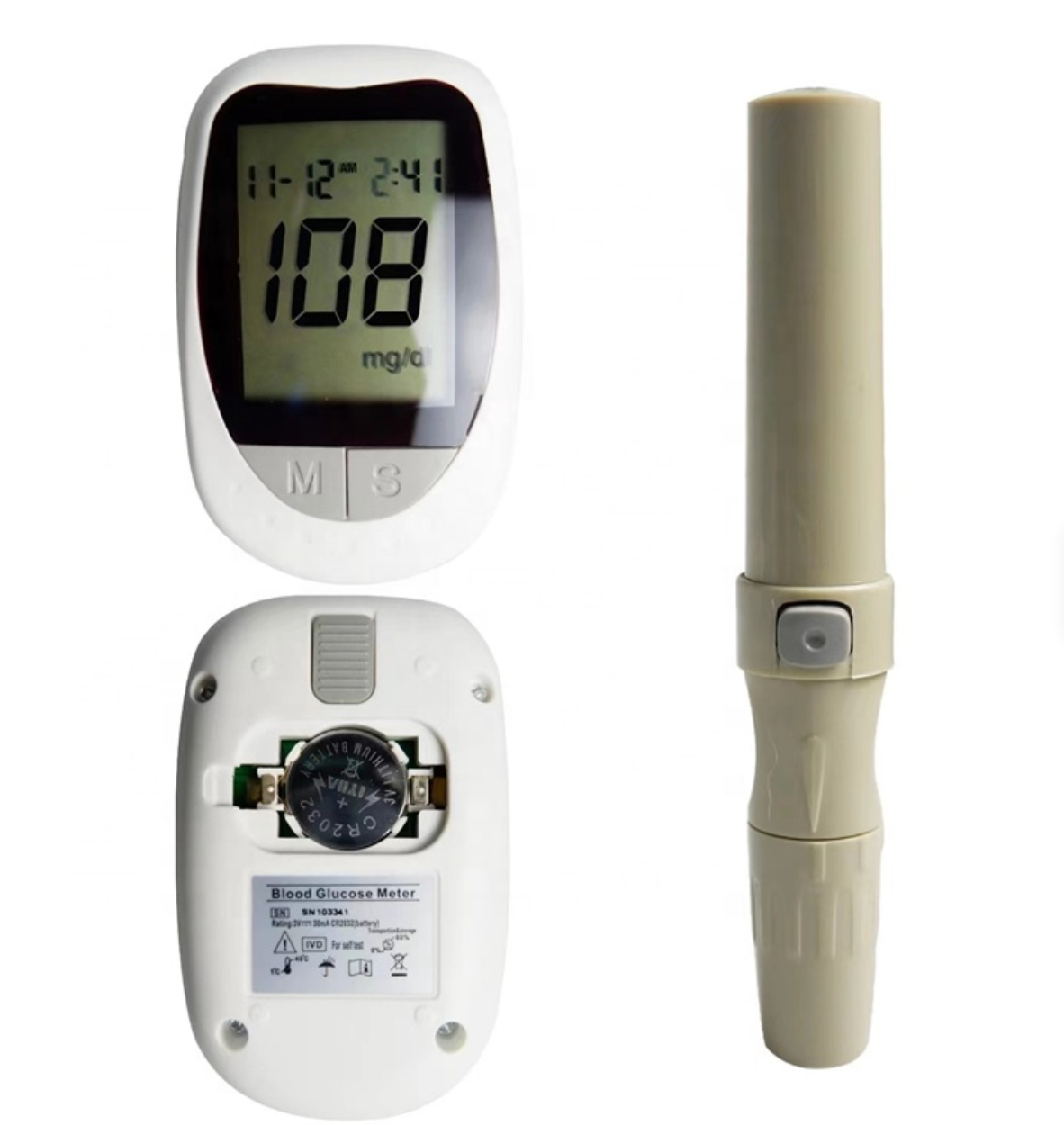 Diseño inteligente: El glucómetro es blanco, ergonómico y tiene solo dos botones grandes (M y S) para navegar fácilmente. Funciona con una batería tipo moneda (CR2032) fácil de cambiar.