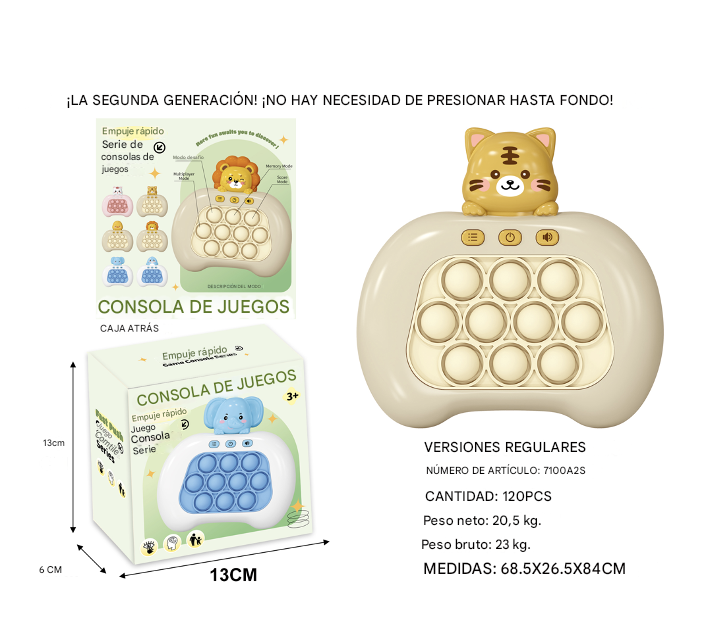 ¡El juguete del momento llegó a Ecuador! Esta consola de Empuje Rápido combina la diversión del pop it con luces, música y 4 modos de juego interactivos. Es el regalo perfecto para que tus hijos se diviertan, mejoren sus reflejos y se concentren, ¡o para que tú te destreses siendo pilas!