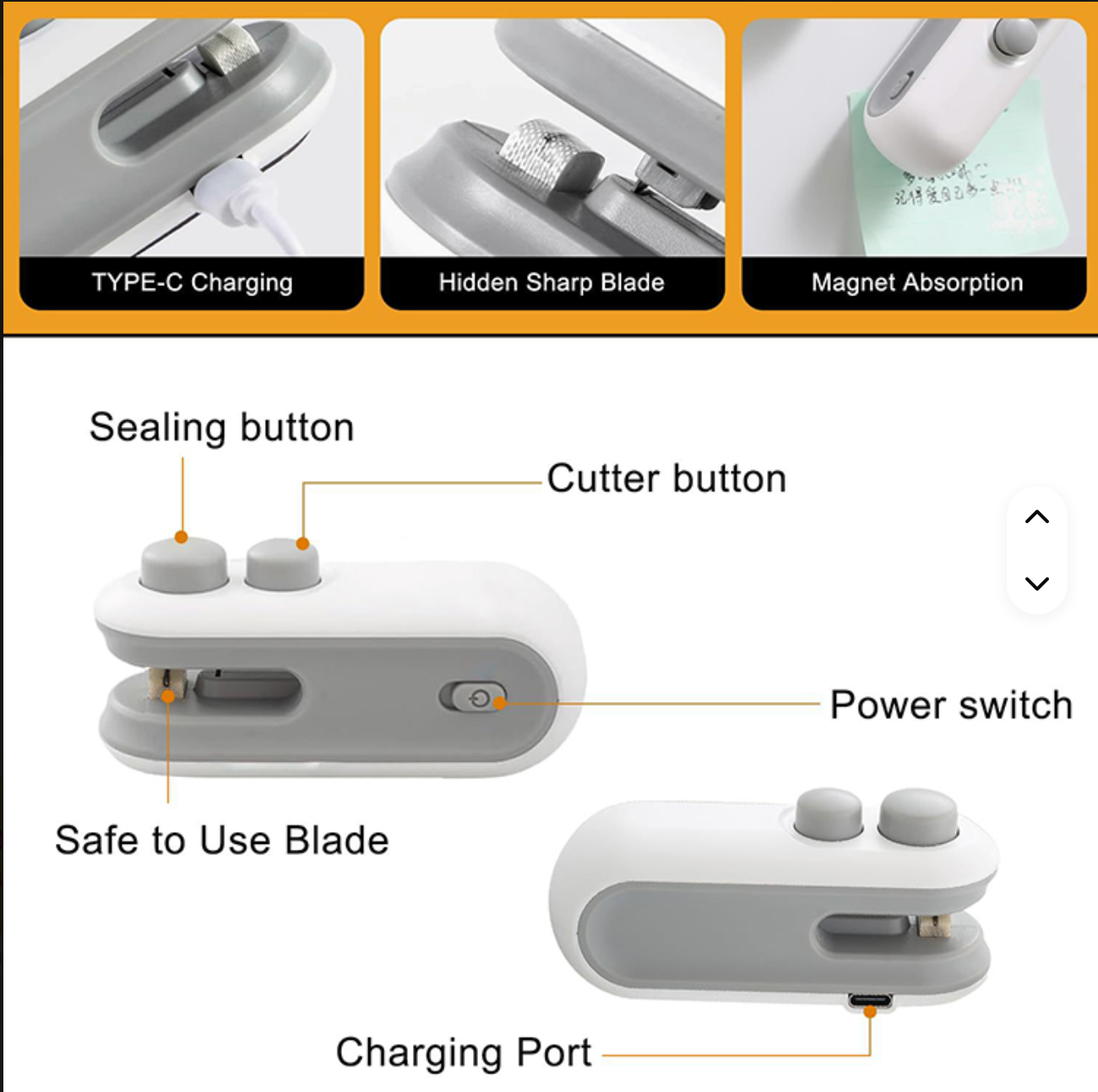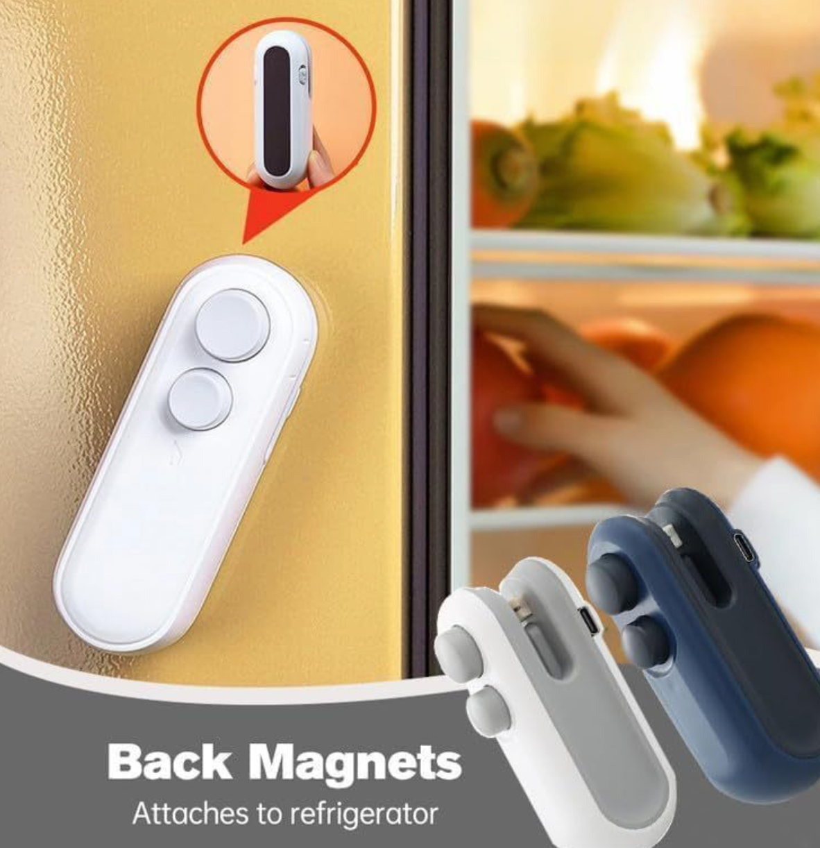 ¡El fin del desperdicio de chifles y papas blandas! Esta máquina selladora portátil 2 en 1 es el gadget que toda cocina pila necesita. Sella herméticamente tus bolsas para mantener la comida 100% fresca y, con su cuchilla oculta, también te ayuda a abrirlas. ¡Se carga por USB-C y se pega a la refrigeradora!